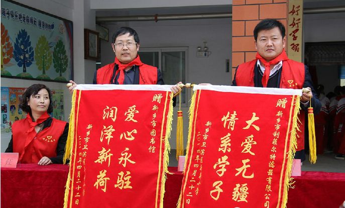 10点30分,在张新艳校长引领下大家从操场穿过来到主席台,市图书馆领导、利菲尔特安总和学校领导在主席台就座,新荷小学全体学生队列整齐的站在主席台前,场面庄严而隆重,当国歌响起那一刻,在场人员全体起立,小学生们纷纷敬礼,国歌回荡在校园的每个角落。张校长勉励学生们:“一本书,一句话都可能会影响孩子一生!谁又敢说这些孩子们将来不会成为国家栋梁,行业精英呢!一定会有的!少年智则国智,愿书籍给你们带来智慧!加油吧,中国少年!。”同时张校长为新乡市利菲尔特滤器授以“大爱无疆,情系学子”锦旗,安总接过锦旗后并发表讲话。活动较后,全体小学生们表演节目《感恩的心》,表达自己心中的那份较纯真的感谢。