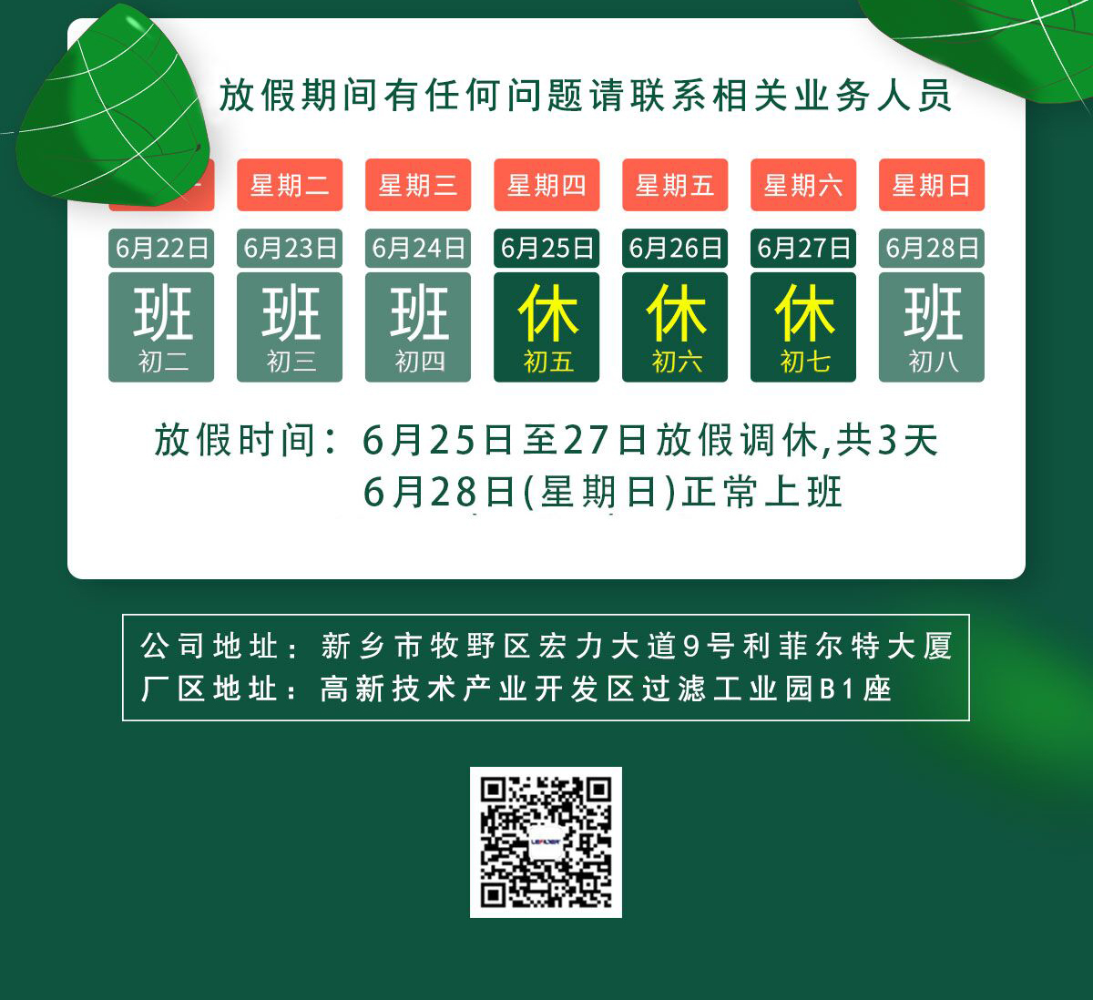 端午即将来临经公司研究决定,端午假期休息6月25日-6月27日共计三天,6月28日(本周日)正式上班。望各位合作伙伴知悉,放假期间有任何问题请随时联系相关业务员,我们会在第一时间给您处理。