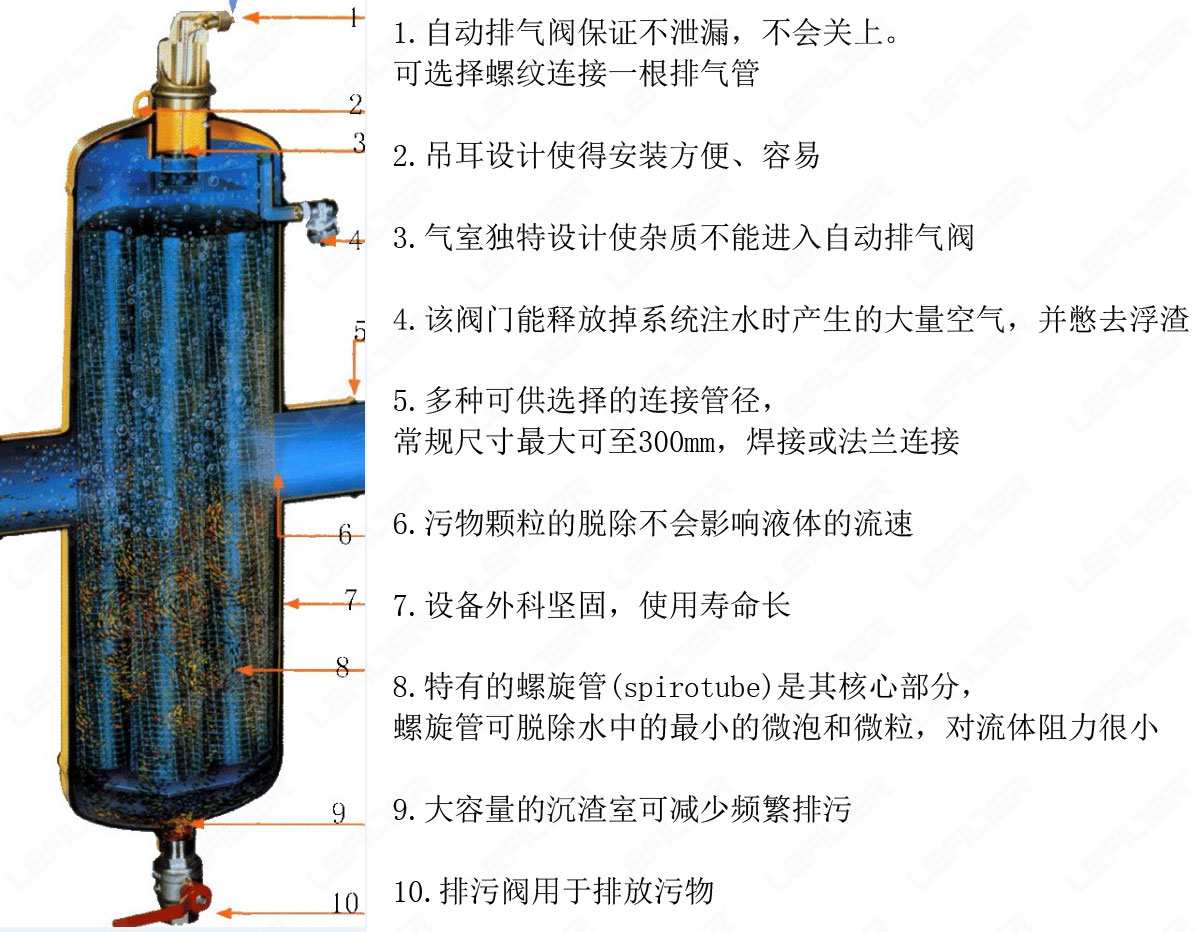 脫氣除污器(別名:空氣雜質分離器)。脫氣除污器——連續不斷工作,發揮雙重功效的脫氣、除污,通過這個裝置可以起到凈化水系統中的氣泡和雜質的功能。由于這個整合的舉動,所有的氣泡和較微小的雜質將會被永久的脫除,保持系統不受氣泡和雜質的困擾。它與傳統的過濾器和除污器的工作方式不同,維護很少。