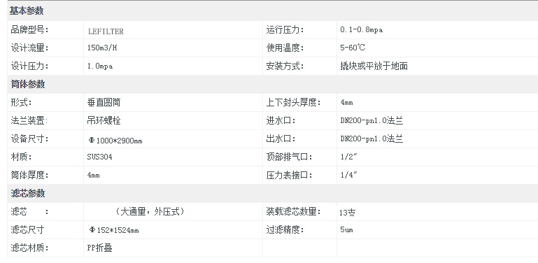 利菲爾特大流量保安過濾器結(jié)構(gòu)為圓柱形殼體,材質(zhì)為304或,316L不銹鋼;配以單支或多支濾芯。