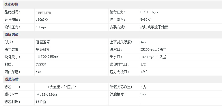 利菲爾特大流量保安過濾器結構為圓柱形殼體,材質為304或,316L不銹鋼;配以單支或多支濾芯。