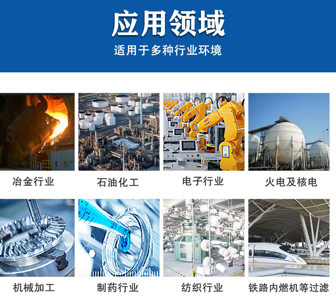 鋼鐵的高爐鼓風、離心式空壓機、燃氣輪機、需長時間運轉的柴油機及汽輪機、對空氣潔凈度要求較高的集中式中央空調系統以及其它大型機組的入口過濾和粉塵涂裝的粉末回收系統