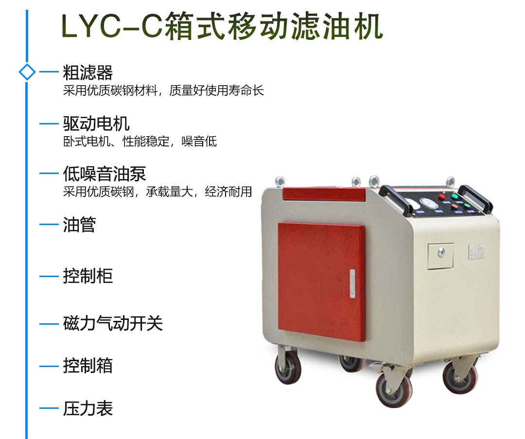 LYC-50C帶油箱式移動濾油機屬于可選攜油箱型。自帶一個油箱,可將自備油箱中的油經自循環過濾達到標準后直接注入系統。尤其適合含有伺服閥、比例溢流閥等精密元件的液壓系統。采用精致外殼包覆所有元件,保護設備免遭外界污染,尤其適用于對使用環境要求高的場合,濾油機具有噪音低、自吸能力強、運轉平穩等特點。同時該殼體采用快開結構,不需要任何工具,便能迅速快捷地打開上蓋,更換濾芯,面板上裝有壓力表,在工作時,連續指示出系統的運行狀況和濾芯的污染程度。