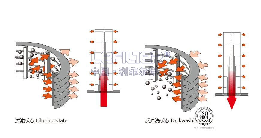 水由入口進入,首先經過粗濾網濾掉較大顆粒的雜質,然后到達細濾網。在過濾過程中,細濾網逐漸累積水中的臟物、雜質,形成過濾雜質層,由于雜質層堆積在細濾網的內側,因此在細濾網的內、外兩側就形成了一個壓差。當自清洗過濾器的壓差達到預設值時,將開始自動清洗過程,此間凈水供應不斷流,清洗閥打開,清洗室及吸污器內水壓大幅度下降,通過濾筒與吸污管的壓力差,吸污管與清洗室之間通過吸嘴產生一個吸力,形成一個吸污過程。同時,電力馬達帶動吸污管沿軸向做螺旋運動。吸污器軸向運動與旋轉運動的結合將整個濾網內表面清洗干凈。整個沖洗過程只需數十秒鐘。排污閥在清洗結束時關閉。過濾器開始準備下一個沖洗周期。