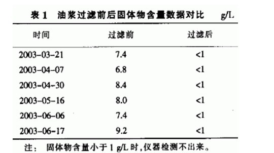主要設備:2臺引進的過濾器是技術核心,另有干氣罐和濾餅罐及氣體放空緩沖罐各一臺。共有17個程序閥門參與程序控制。主要工藝控制關鍵點:過濾器正向差壓任何時刻不得大于0.7 MPa。過濾器反向差壓任何時刻不得大于0.4 MPa,濾餅罐液控設5%報警下限,防止壓空。 2.2 過濾器運行效果 油漿過濾器系統設計能力為8 t/h,在經歷了安裝、吹掃、試壓、程序調試后于2003年3月投入運行,總體運行平穩。但初期也遇到過一些問題,如2個過濾器的卸料閥因開關不到位影響了卸料效果;濾餅罐定壓值給定偏低,影響正常的濾餅壓送。2003年7月曾發現過濾后油漿固體物升高,過濾器差壓變小,直至2004年3月裝置停工改造時過濾器停運,打開檢查發現,每組過濾器都有1根濾芯被壓破。2004年4月再次投入運行后一直到2005年5月裝置停工:濾芯清洗后于2005年8月再次投入運行。 該過濾器在正常生產時油漿過濾前后數據對比見表1。 從表1可以看出,過濾前的油漿固體物含量通常在6~