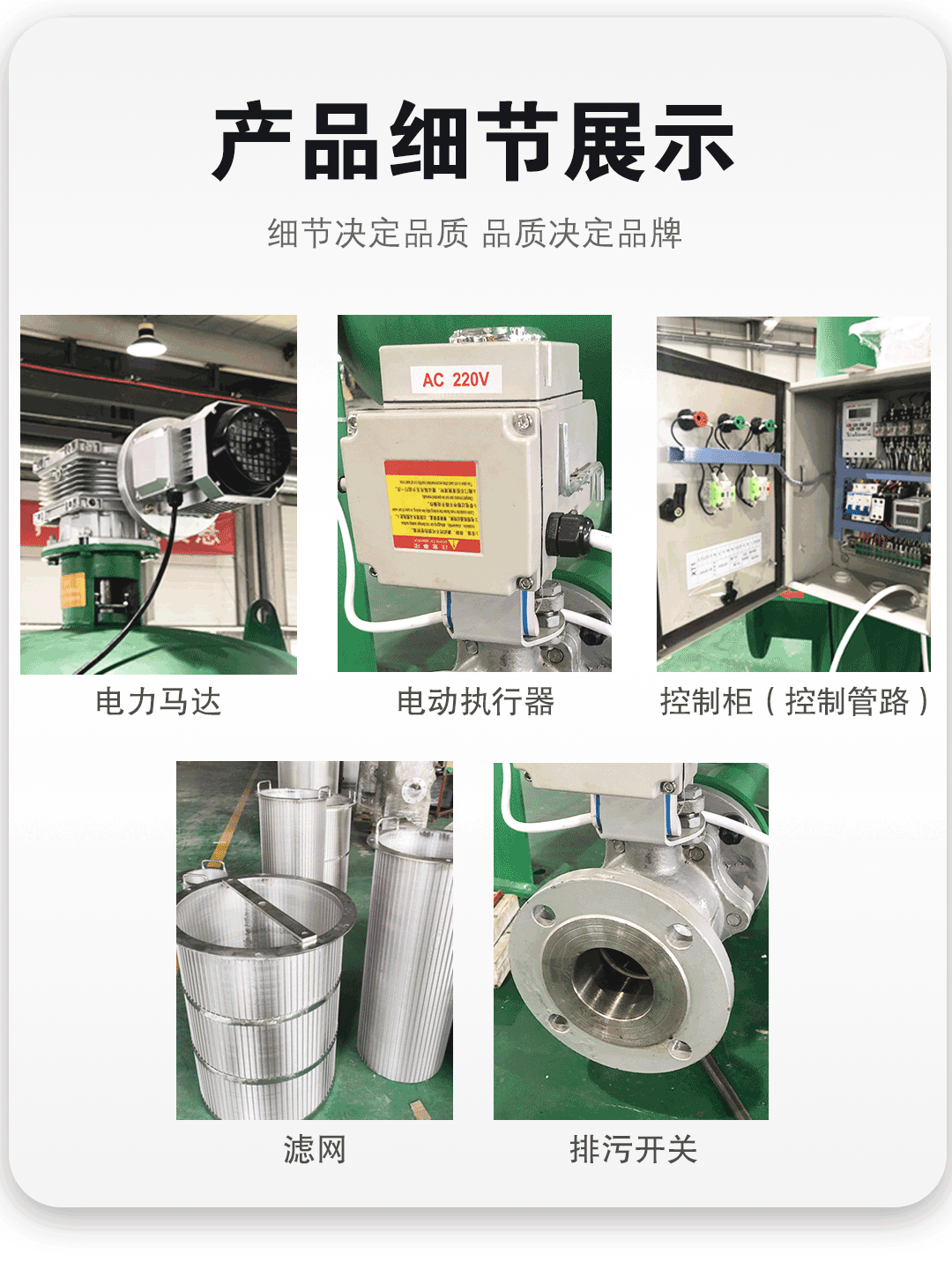 吸吮式自清洗過濾器由殼體、多元濾芯、反洗機構、電氣控制系統、動力裝置、電動排污閥及差壓控制系統組成。自清洗過濾器殼體內濾芯花板將內腔分為上、下兩腔,上腔內配有多個濾芯,這樣充分利用了空間,顯著縮小了過濾器體積,下腔內安裝有反;中洗吸盤。工作時,濁液經入口進入過濾器,又經花板孔進入濾芯內腔,大于濾芯孔隙的雜質被截流,凈液穿過濾芯孔隙到達上腔由出口流出。當過濾器內雜質積聚在濾芯表面引起進出口壓差增大到設定值時,或定時器達到預置時間時,電氣控制系統發出信號,驅動反;中洗機構。當反沖洗吸盤口與濾芯進口正對時,排污閥打開,此時系統泄壓排污,吸盤與濾芯內側出現一個相對壓力低于濾芯外側壓力的負壓區,迫使部分循環液從濾芯外側流向濾芯內側。吸附在濾芯內壁上的雜質微粒隨液流進入吸吮排污器內并從排污閥排出。特殊設計的濾芯使濾芯產生噴射效果,任何雜質都將被沖走。當進出口壓差恢復正常或定時器設定時間結束,電機停止運轉,電動排污閥關閉。整個過程中,液流不斷流,反洗耗液量少,實現了連續化,自動化生產。本過濾器減速機采用NRV型減速機,外殼采優質鋁合金壓鑄結構,散熱性好、噪聲小,重量輕,承載能力大。密封裝置采用CV62.1-85標準增強四氟雙端面密封結構,密封性能可靠、使用壽命長、承壓能力強。※頂部設有排氣閥,結構緊湊、啟閉靈敏。壓差控制系統采用D520/7DD切換差可調式差壓控制器,信號反饋正確、靈敏。多元濾芯結構,有效過濾面積大,壓降小,反沖洗效率高。濾芯花板采用不銹鋼,與反沖洗吸盤工作界面進行鏡面處理。※反沖洗吸盤采用增強聚四氟乙烯結構及反沖洗自整機構,能確保吸盤與濾芯花板的長效密封,增強了反洗效果。※電氣控制系統采用PLC可編程控制器,清洗模式采用差壓控制、定時控制及手動控制并聯模式,清洗模式采用定時定位模式,反洗流量小,反洗徹底。