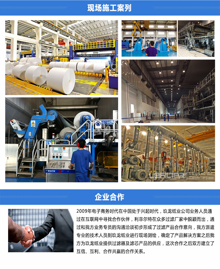 2009年電子商務(wù)時(shí)代在中國(guó)處于興起時(shí)代,玖龍紙業(yè)公司業(yè)務(wù)人員通過(guò)在互聯(lián)網(wǎng)中尋找合作伙伴,利菲爾特在眾多過(guò)濾廠家中脫穎而出,通過(guò)和我方業(yè)務(wù)專員的溝通洽談初步形成了過(guò)濾產(chǎn)品合作意向,我方派遣專業(yè)的技術(shù)人員到玖龍紙業(yè)進(jìn)行現(xiàn)場(chǎng)測(cè)繪,確定了產(chǎn)品解決方案之后我方為玖龍紙業(yè)提供過(guò)濾器及濾芯產(chǎn)品的供應(yīng),這次合作之后雙方建立了互信、互利、合作共贏的合作關(guān)系。