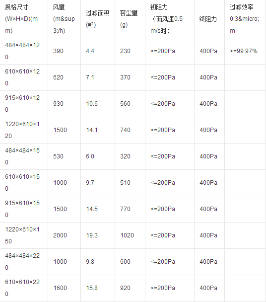 耐高溫高效過濾器使用有隔板設計,波紋形隔板可以準確地保持褶層間距,在較小阻力下,較大限度地利用濾料,過濾器濾材兩面180褶翻褶形褶層,濾料折彎時有兩道壓痕,使其在隔板的尾端開成鍥形盒式褶層,鍥形盒式褶層可以防止濾料破損。耐高溫型玻璃纖維濾紙;不銹鋼外框、鋁框;密封膠:耐高溫型硅膠;密封墊:硅橡膠;逐臺激光計數效率:99.99%@0.3um效率等級:H13;耐高溫高效過濾器連續運行溫度300度,較高溫度可達350度。