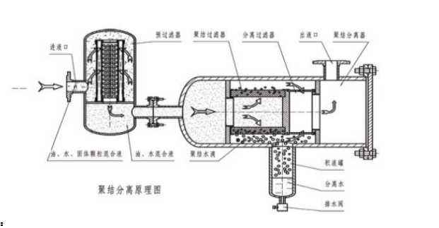 分離系統的分離濾芯由特殊的疏水材料制成,油液通過濾芯時,水珠被擋在濾芯的外表面,相互聚結直至因重力作用,沉降至儲水罐內。