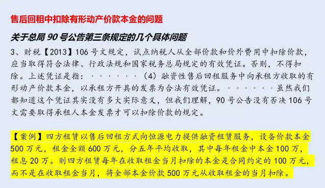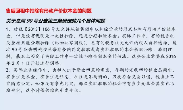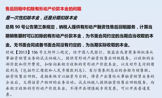 90號公告第三條規定,納稅人提供有形動產融資性售后回租服務,計算當期銷售額時可以扣除的有形動產價款本金,為書面合同約定的當期應當收取的本金。無書面合同或者書面合同沒有約定的,為當期實際收取的本金。