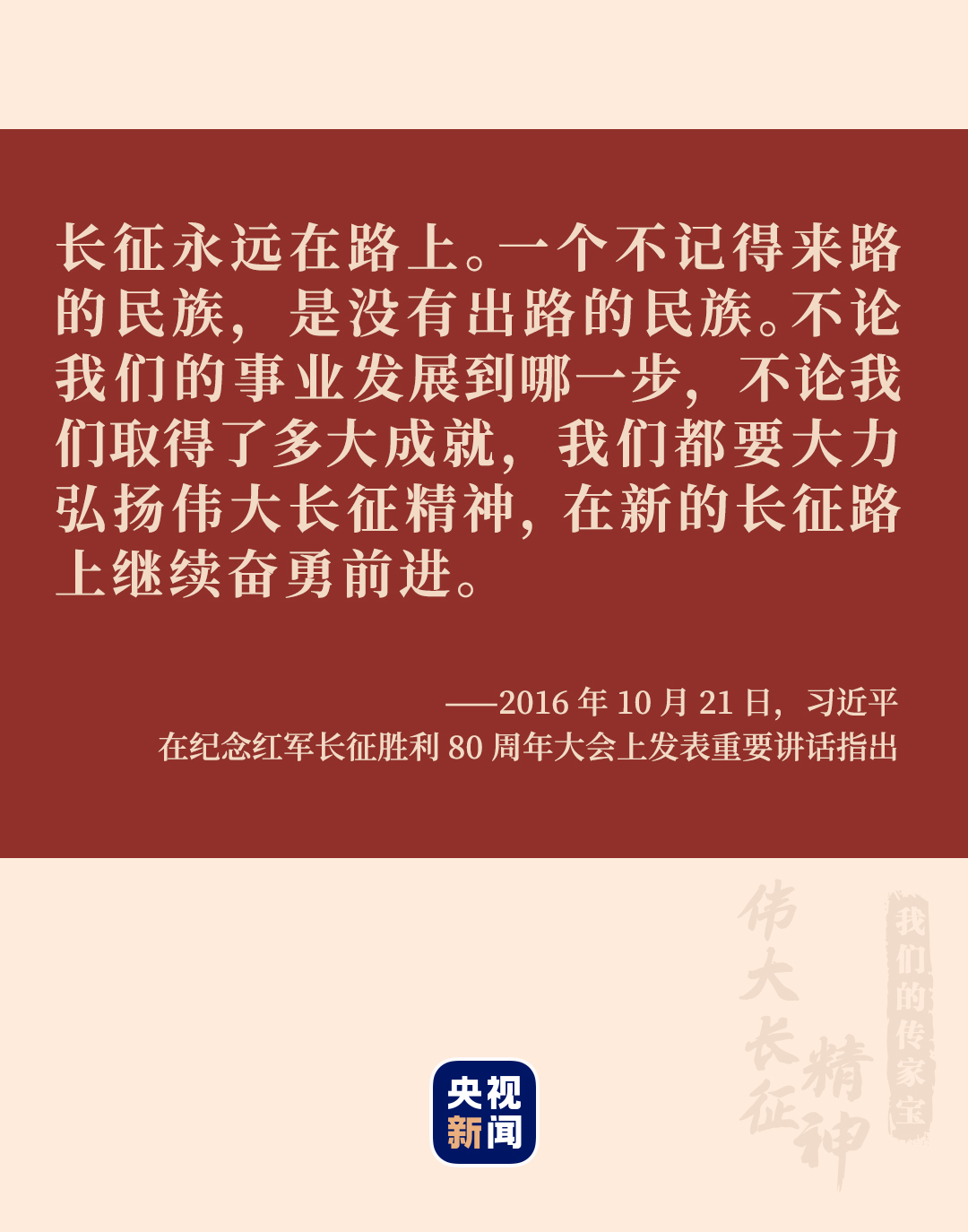 2016年10月,習(xí)近平總書(shū)記在紀(jì)念紅軍長(zhǎng)征勝利80周年大會(huì)上指出,震撼世界、彪炳史冊(cè)的長(zhǎng)征,宣告了國(guó)民黨反動(dòng)派消滅中國(guó)共產(chǎn)黨和紅軍的圖謀徹底失敗,宣告了中國(guó)共產(chǎn)黨和紅軍肩負(fù)著民族希望勝利實(shí)現(xiàn)了北上抗日的戰(zhàn)略轉(zhuǎn)移,實(shí)現(xiàn)了中國(guó)共產(chǎn)黨和中國(guó)革命事業(yè)從挫折走向勝利的偉大轉(zhuǎn)折,開(kāi)啟了中國(guó)共產(chǎn)黨為實(shí)現(xiàn)民族獨(dú)立、人民解放而斗爭(zhēng)的新的偉大進(jìn)軍。