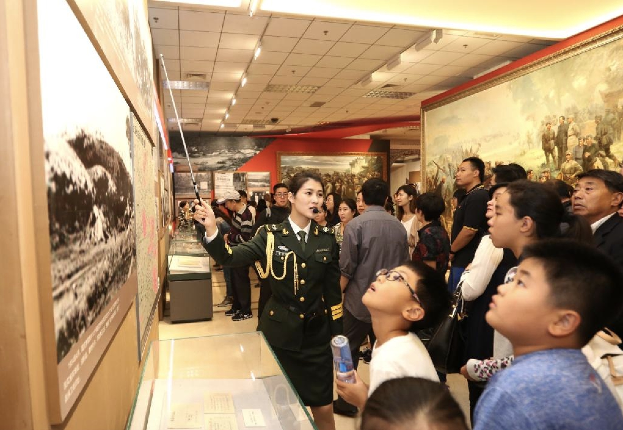 北京中國(guó)人民革命軍事博物館開(kāi)放“英雄史詩(shī) 不朽豐碑——紀(jì)念中國(guó)工農(nóng)紅軍長(zhǎng)征勝利80周年主題展覽”,解說(shuō)員在為參觀者講解。