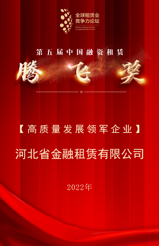 日前,第九屆全球租賃業(yè)競(jìng)爭(zhēng)力論壇年度峰會(huì)圓滿召開,河北省金融租賃有限公司(以下簡(jiǎn)稱“河北金租”或“公司”)再度攬下中國(guó)融資租賃“騰飛獎(jiǎng)”,榮獲“高質(zhì)量發(fā)展領(lǐng)軍企業(yè)”榮譽(yù)。