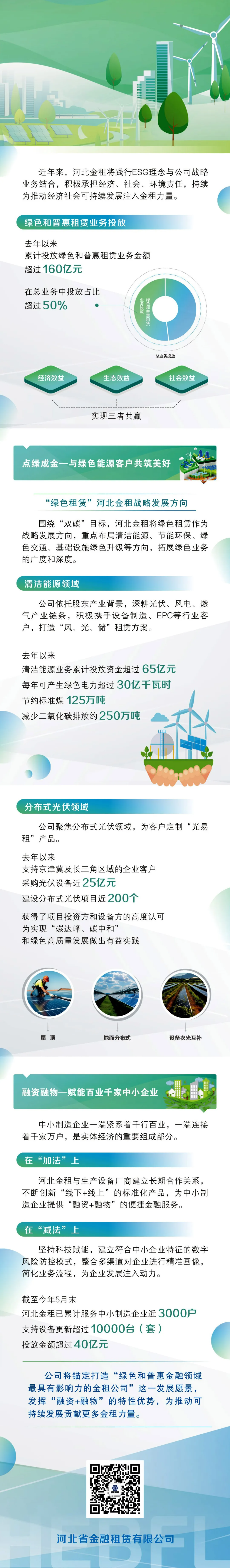 近年來(lái),河北金租將踐行ESG理念與公司戰(zhàn)略業(yè)務(wù)結(jié)合,積極承擔(dān)經(jīng)濟(jì)、社會(huì)、環(huán)境責(zé)任,持續(xù)為推動(dòng)經(jīng)濟(jì)社會(huì)可持續(xù)發(fā)展注入金租力量。去年以來(lái),累計(jì)投放綠色和普惠租賃業(yè)務(wù)金額超過(guò)160億元,在總業(yè)務(wù)中投放占比超過(guò)50%,實(shí)現(xiàn)經(jīng)濟(jì)效益、生態(tài)效益、社會(huì)效益三者共贏。