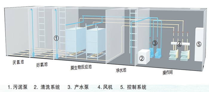 一體化MBR污水處理設(shè)備可以做地埋式也可以做地面式,都是以MBR系統(tǒng)及生化法為核心處理污水,一般項目的處理水量在100噸以內(nèi), 這樣用一體化污水處理設(shè)備造價成本比傳統(tǒng)工藝更低,性價比更高。 膜生物反應器(MBR)技術(shù)以超、微濾膜分離過程取代傳統(tǒng)活性污泥處理過程中的泥水重力沉降分離過程進行固液分離,由于采用膜分離,因此可以保持很高的生物相濃度和非常優(yōu)異的出水效果。可有效去除水中的有機物與氨氮等污染物質(zhì),具有許多其他生物處理技術(shù)無法比擬的明顯優(yōu)勢。 下圖為MBR膜生物反應器(MBR)的工藝原理示意圖: