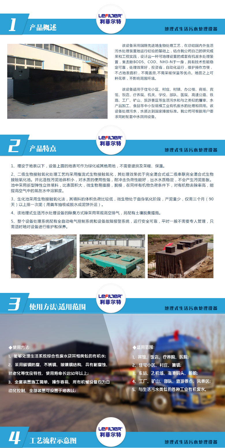 該設(shè)備采用國際先進(jìn)的生物處理工藝,在總結(jié)國內(nèi)外生活污水處理裝置的運行經(jīng)驗基礎(chǔ)上,結(jié)合我公司自己的研究成果和工程實踐,設(shè)計出一種可地理設(shè)置的成套有機廢水處理裝置,集去除BOD5、COD、NH3于一身,具有技術(shù)性能穩(wěn)定,處理效果好,投資省,自動化運行,維護(hù)操作方便等特點。
